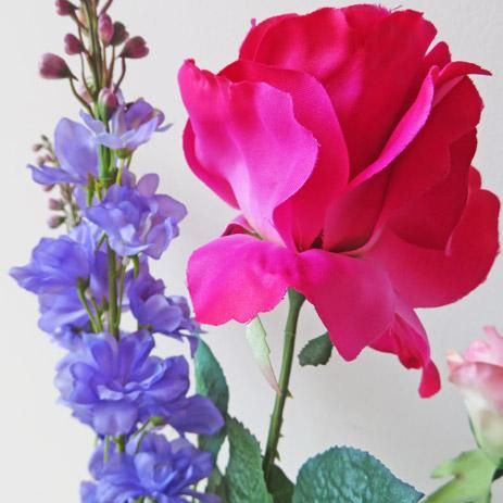 高級造花アレンジメント【アルマ】バラの中にファレノ・コチョウランを一枝入れることで、どうなるんだろう?溶け込むような曲線がラインが見所です。