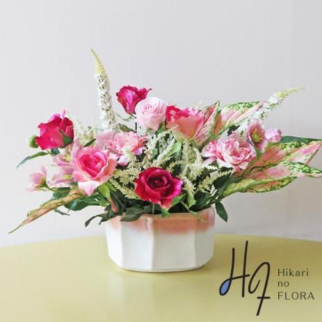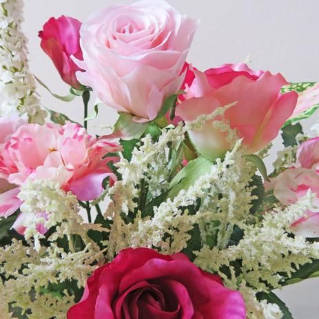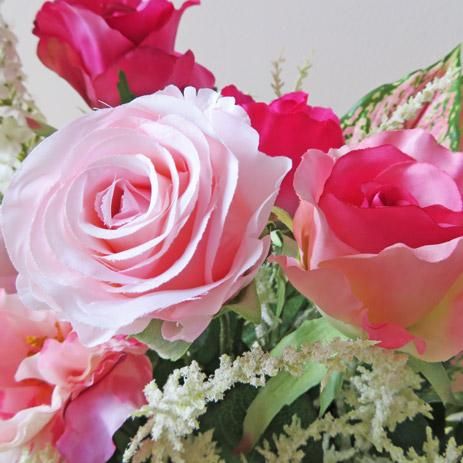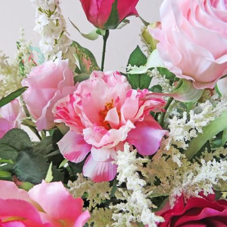 高級造花アレンジメント【デーリア】バキアを入れることでピンク感をより強調しました。素敵な6種のバラも見所です。