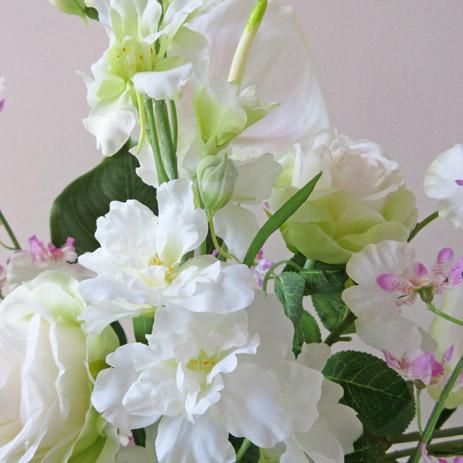 高級造花アレンジメント【マルファ】ホワイトグリーンやクリームホワイトの色彩の穏やかな感じが素敵な、高級造花アレンジメントです。