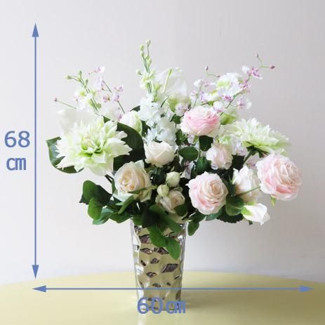 優しいホワイト系の色彩が素敵な高級造花アレンジメントです。花材は、ローズ、アンスリウム、オンシジューム、ユーカリ、ダリア、デルフィニュームなどです。花器は、陶器製のメタリック調。光触媒加工品なのでホコリが付きにくくキレイが続きます。