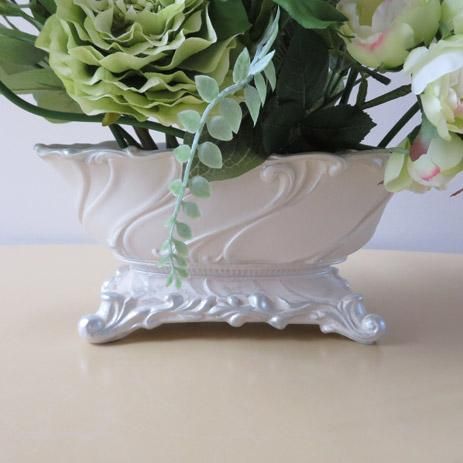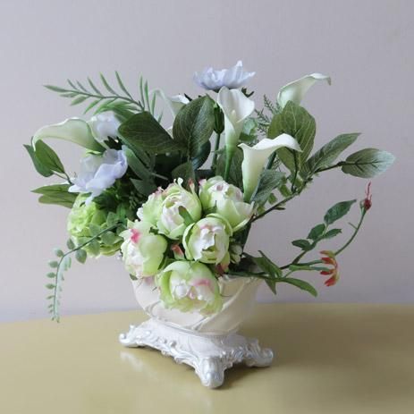 高級造花アレンジメント【九谷焼・武腰美恵子「フルート&花束」】九谷焼人気作家・武腰美恵子先生の花器に高級造花をアレンジしました。