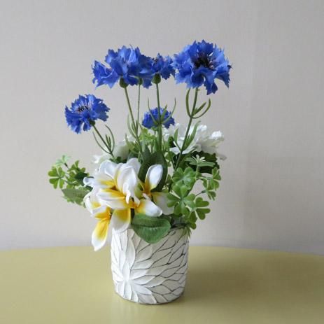 高級造花アレンジメント【ティーナ】花言葉「幸運・幸福」コーンフラワーとプルメリアのアレンジメントです。