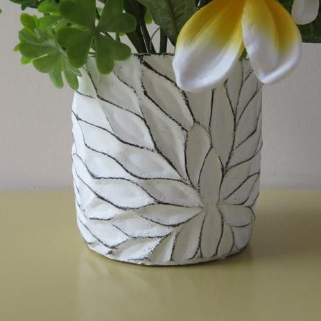 コーンフラワーの花言葉も「幸運・幸福」でとてもいいですね。プルメリアの花言葉は「気品」「恵まれた人」です。もちろん香りの良いことでも有名ですよね。ホノルル空港いっぱいに香りが放たれています。花器は、陶器製です。