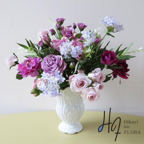 色彩に個性を持たせました。とてもエレガントな仕上がりになったかと思います。花器は、陶器製です。