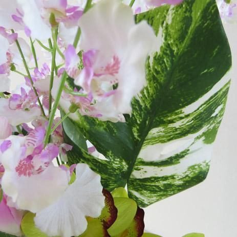 高級造花アレンジメント【ジョルジーナ】オンシジュームとリリィーが優しい色彩で、清々しさも感じられる、高級造花アレンジメントです。