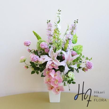 光触媒高級造花アレンジメント【ムート】オンシジュームとシンビジュームを八重咲リリィーと共にアレンジした高級造花アレンジメント。高さ90cmです。