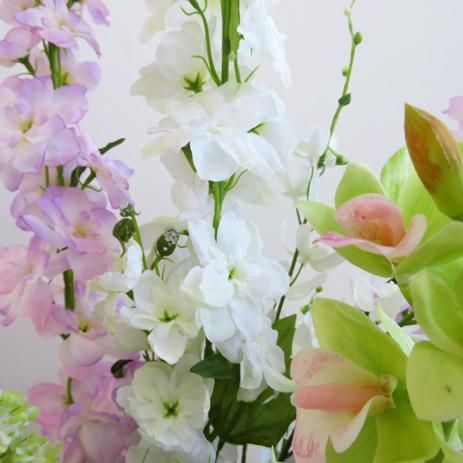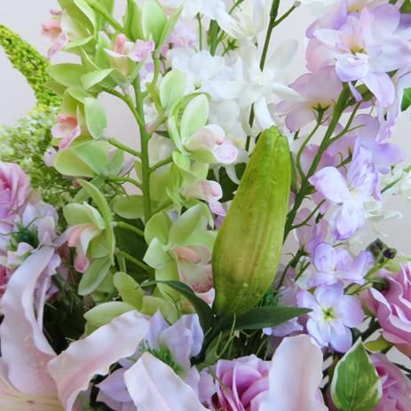 これは?と目を惹く、フォックステールリリィもあれば、リアルな胡蝶蘭とカサブランカ。淡い色彩の中に、高級感・上質感を感じます。ワンラック上の高級造花はいかがでしょうか。人が立ち止まるアレンジメントです。