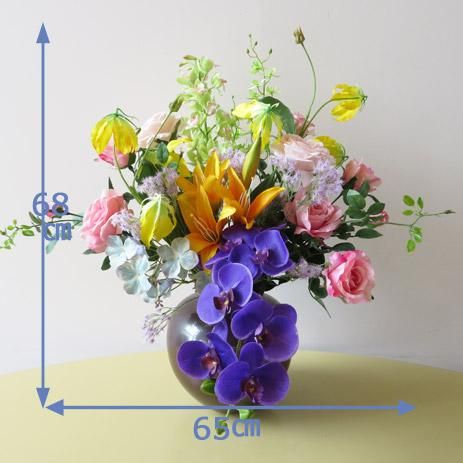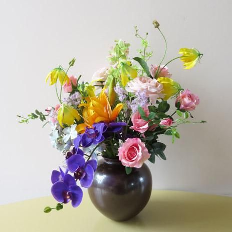 花材は、胡蝶蘭、ハイドレンジア、バラ、シンビジューム、リリー、グロリオサなどです。花器は、九谷焼産地サビ釉薬八寸です。