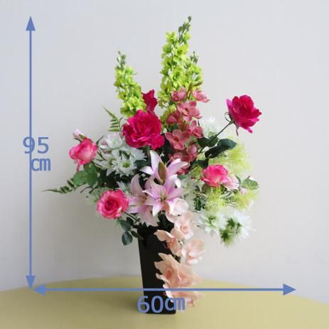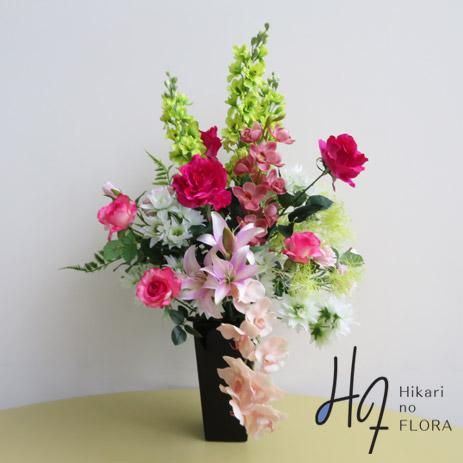 光触媒高級造花アレンジメント【ロリィタ】デルフィニウムのグリーンとホットピンク、ビュティーレッドのバラが美しい高級造花アレンジメントです。