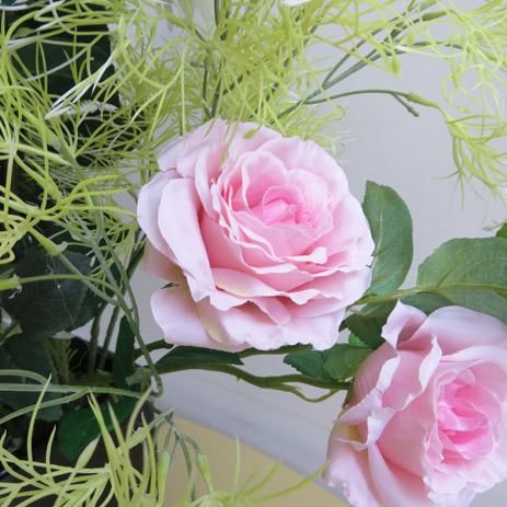 高級造花アレンジメント【デーリア】バキアを入れることでピンク感をより強調しました。素敵な6種のバラも見所です。