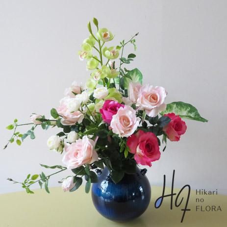 光触媒高級造花アレンジメント【アデッソ】信楽焼・瑠璃楽かびんにアーティフィシャルフラワーをアレンジしました。