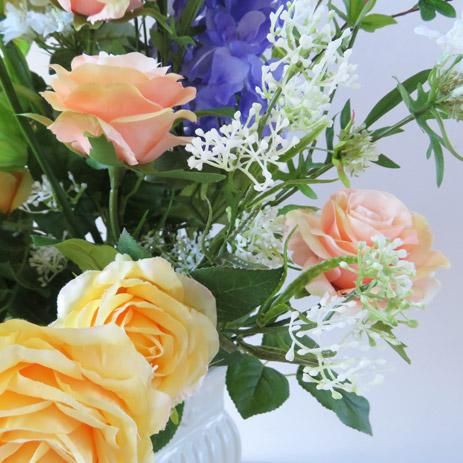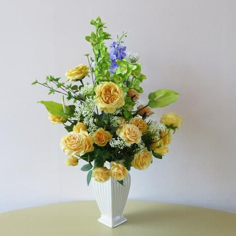 3種のローズとデルフィニューム、シンビジュームそしてドウダンの枝。レースフラワーで柔らかさを出してボリュームを付けました。イエローとグリーンだけど、目立ちます!フロアーの主役はお任せ。花器は、国内トップメーカーの陶器製花器です。