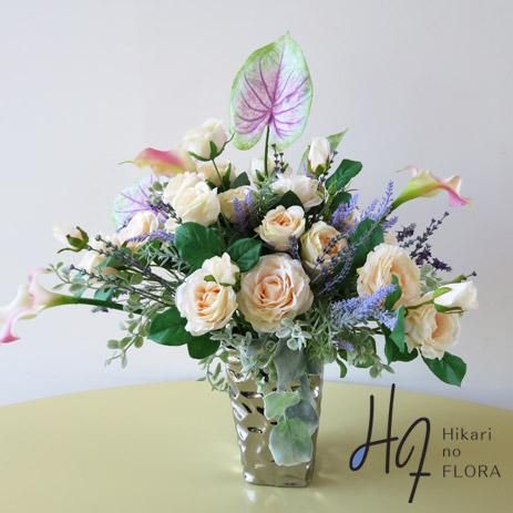 光触媒高級造花アレンジメント【アドアリーナ】ラベンダーとバラとカラジュームの高級造花アレンジメントです。