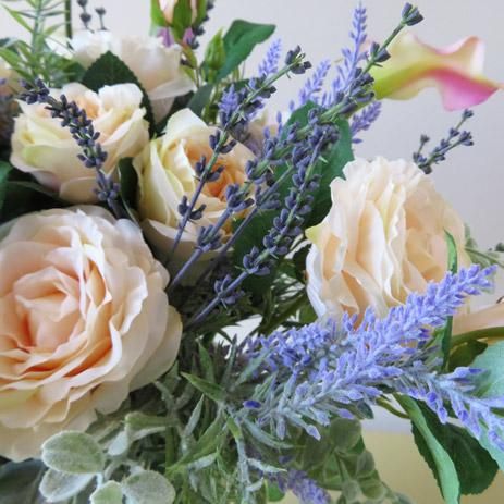 ピーチ色の優しい色彩とラベンダーが素敵な高級造花アレンジメントです。