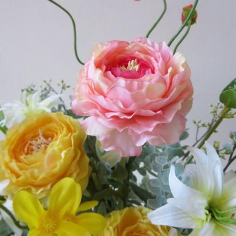 光触媒高級造花アレンジメント【シュネル】軽やかさと華やかさを持つ、リュクスラナンキュラスの造花アレンジメントです。高さ35cmです。