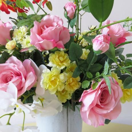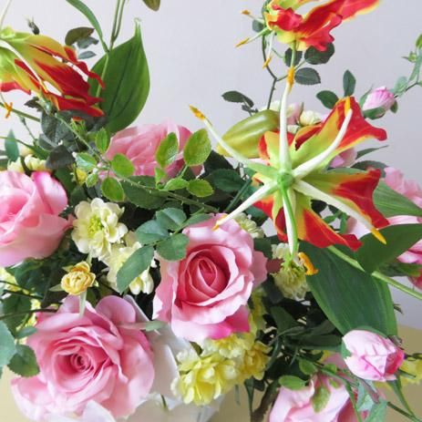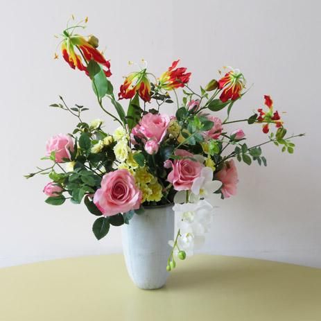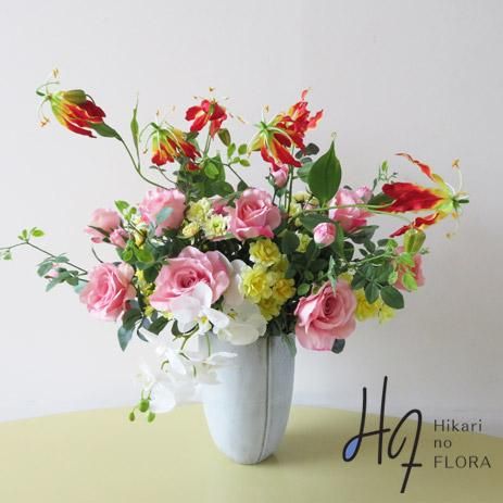 光触媒高級造花アレンジメント【オプス】ピンクローズとグロリオサ、そしてホワイトファレノの高級造花アレンジメントです