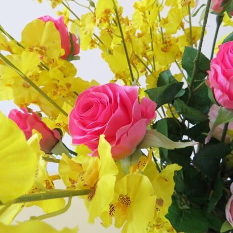 安定のアレンジメントと申しましょうか、オンシジュームとばらのアレンジメントです。高さは約70cmありますので、華やかさは量的にも十分あります。花器は、個性的な色彩です。