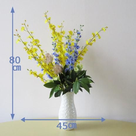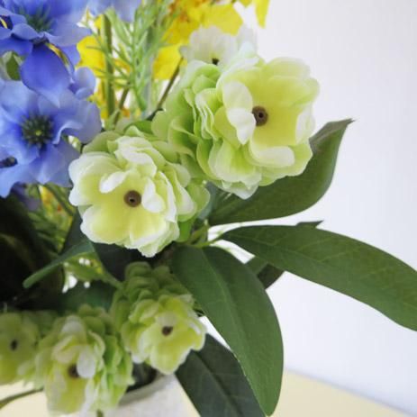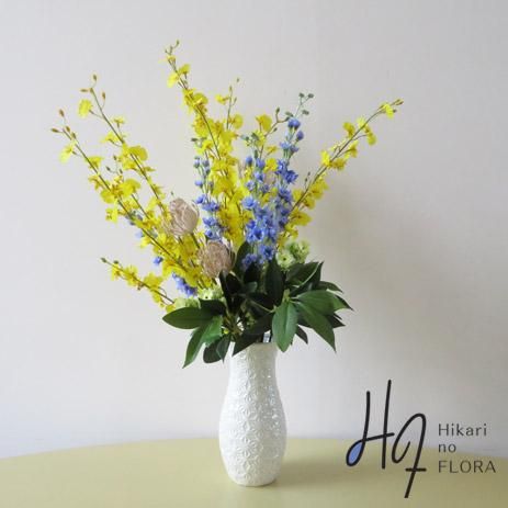 縁起を担いで全体として「黄色(金運・幸運)」のイメージを強めながら、「ローレル(月桂樹」などをアレンジしました。花材の素材もいいので、個性的で質のいい高級造花アレンジメントに仕上がっています。花器も麻の葉文様を連想させる、和洋瀬中の感じがします。お祝いごとにどうぞ。