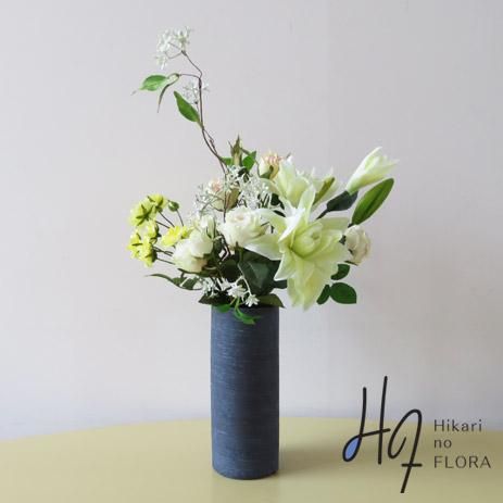 刷毛目の美しい陶器製花器に、優しく質の高いお花をアレンジしました。八重咲リリーの美しさが際立つようアレンジしています。縦長花器のアレンジメントの個性が輝きます。