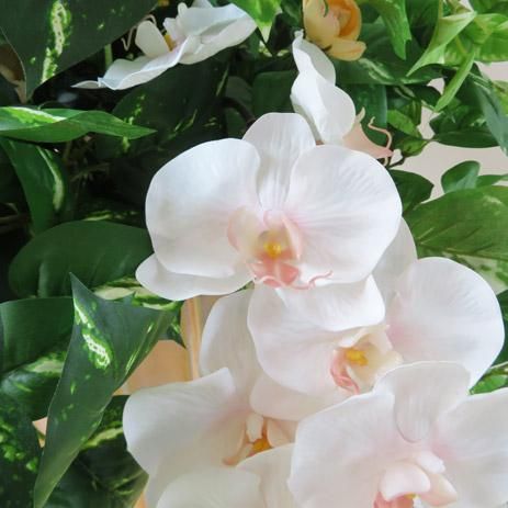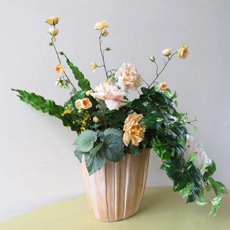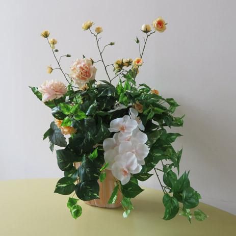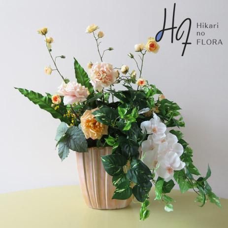 個性的に咲くローズをトップに持ってきました。胡蝶蘭を入れて上品に。グリーンは、ポトス、タニワタリ、ベゴニアなどをアレンジしました。ナチュラル感があるアレンジメントです。花器は、国内トップメーカーの異郷の感を感じさせる明るくソフトなアースカラーが特徴で、器の形に沿って釉薬が大胆に変化しています。お花のナチュラル感を高めてくれます。