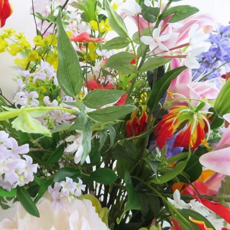 16種の花々をアレンジしました。花屋さんで年中見かける花々でアレンジいたしました。季節感を出さず、華やかにアレンジしましたので、壇上でもかなり見栄えがいいかと思います。