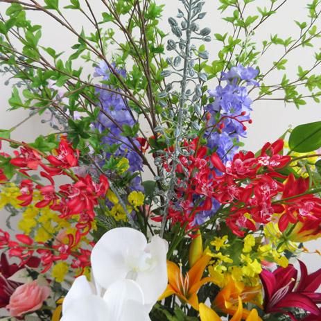 ドウダンの枝、オンシジューム、オーキッド、デルフィニウム、リリィー、グロリオサ、ローズなど12種の花々でアレンジいたしました。