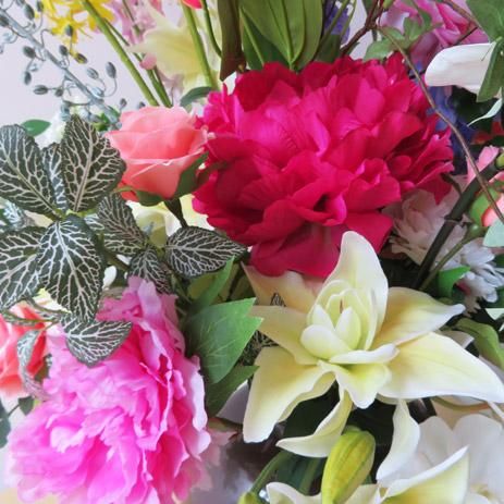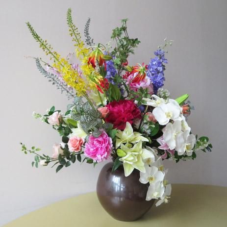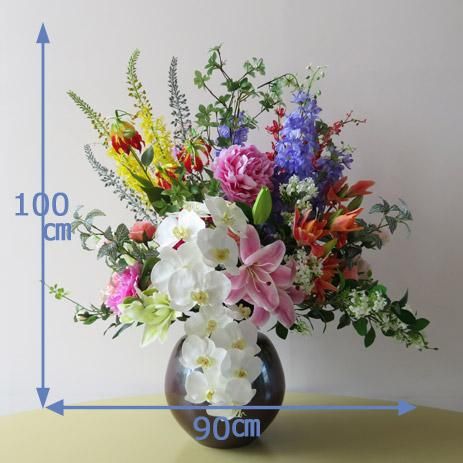 演台花ということで、お花の展開は220度くらいです。背面からの視線は考えていません。高級造花18種でアレンジしました。