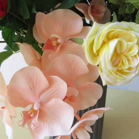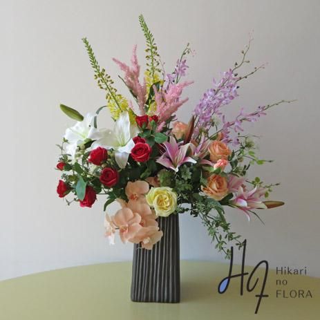 アーティフィシャルフラワー(高級造花)をアレンジしたので、見ごたえのあるワンランク上の花々でいっぱいです。花材は、カサブランカ、レースフラワー、アスチルベ、シンビジューム、パキラ、ローズなどです。花器は、国内トップメーカーの陶器製です。