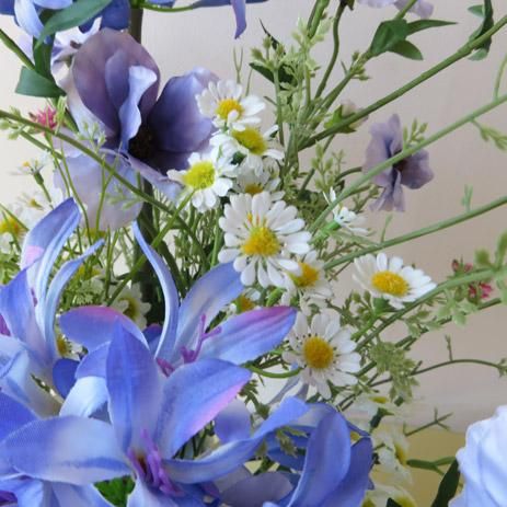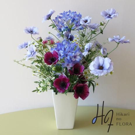 花材は、ラナンキュラスとアネモネ、アガパンサス、カモミールなどです。個性的で形状も色彩も美しいアートフラワーです。