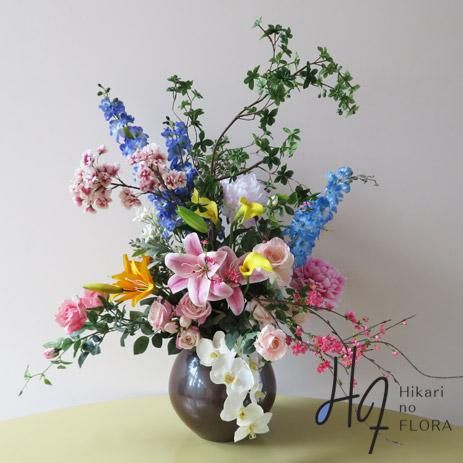 ドウダンの枝、山桜、カラー、オーキッド、デルフィニウム、リリィー、ローズなど17種の花々でアレンジいたしました。