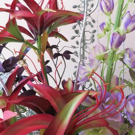 光触媒造花アレンジメント【ロレータ・壁面当て】新しいカテゴリーの「油絵」を思わせる色彩のアーティフィシャルフラワー・高級造花アレンジメント。高さは75cm。