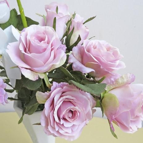 ホワイト色胡蝶蘭に、モーブラベンダー色系のローズで、大人オシャレな高級造花インテリアにしました。ご自分でお好みに曲げていただいてもいですよ。