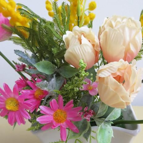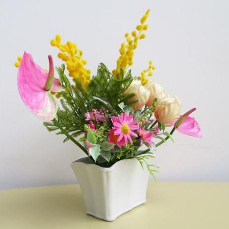ミモザ(花言葉:感謝・友情)とアンスリウム(花言葉:情熱)チューリップのアレンジメントです。花器は、国内トップメーカーの陶器製です。