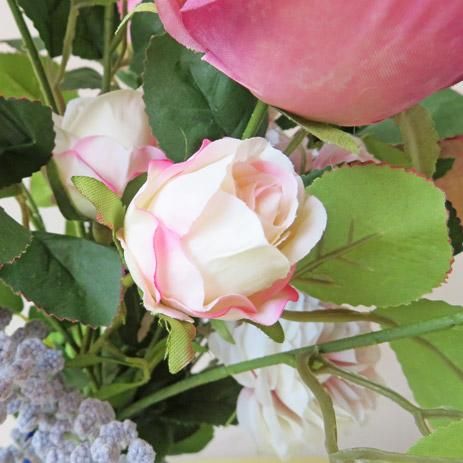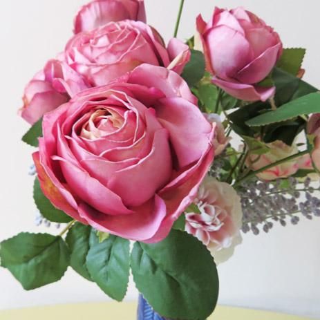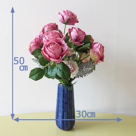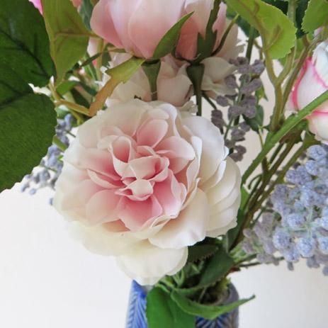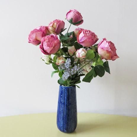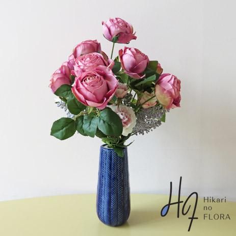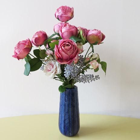 光触媒高級造花アレンジメント【ベニアミナ】インディゴブルーの花器に、シックなローズをいれました。