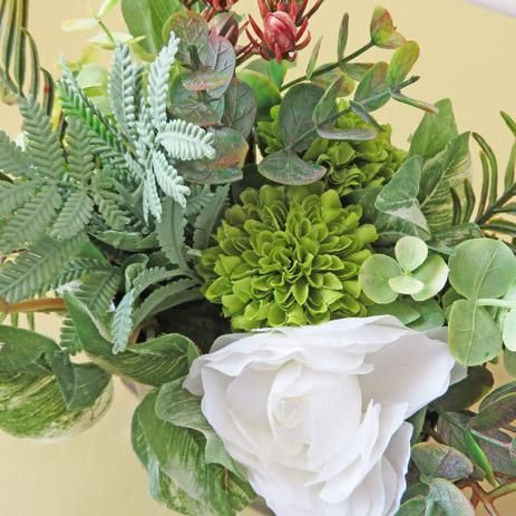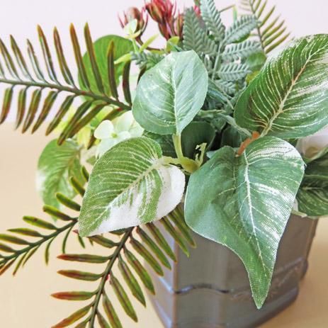 左右に広げた多種の葉にマムとラナンキュラスをアレンジしました。花器に合わせて少しレトロな配色をしたおしゃれな仕上がりです。造花ですので、一切お世話不要。留守が多い方や、ご年配の方にも喜ばれています。