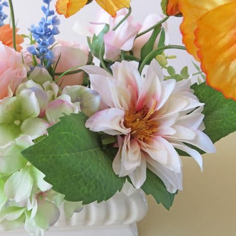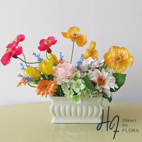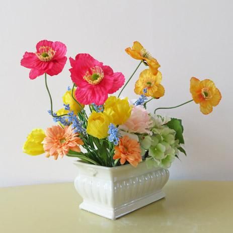 ふわりふわりと風に揺れるポピーを見るようです。とても愛らしくて、明るくて素敵な造花アレンジメントになりました。大事な方へいかがでしょうか。心を込めたメッセージカード添えて贈りませんか。