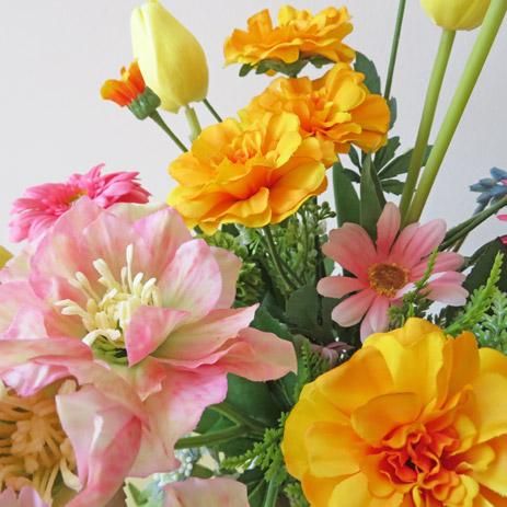 花材は、マリーゴールド、ミニチューリップ、デージー、ガーベラ、ローズなどです。