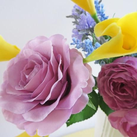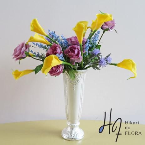 カラーとローズのアレンジメントです。イエローとブルーの配色も素敵です。
