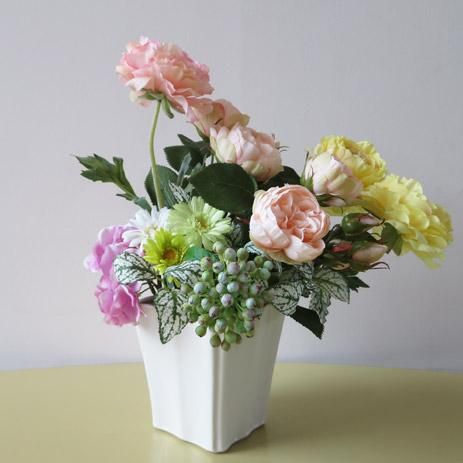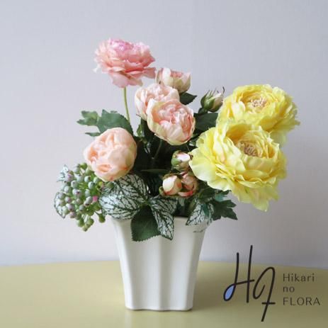 美しい薔薇とラナンキュラスの素敵な造花アレンジメントです。花器は、国内トップメーカーの陶器製です。