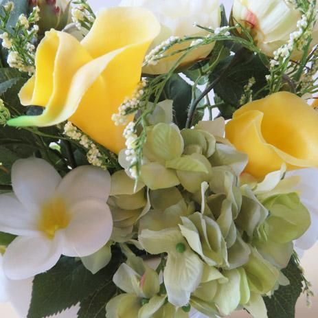 カラーとローズとプルメリアの造花アレンジメントです。花器は、国内トップメーカーの陶器製です。