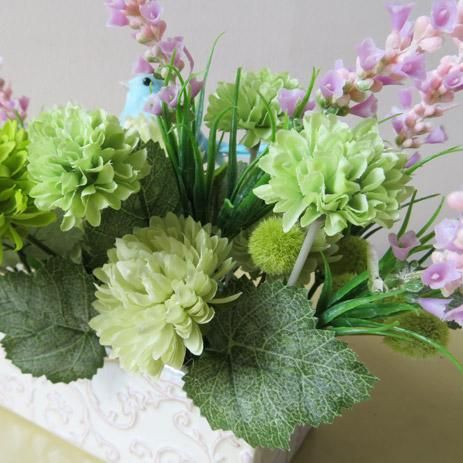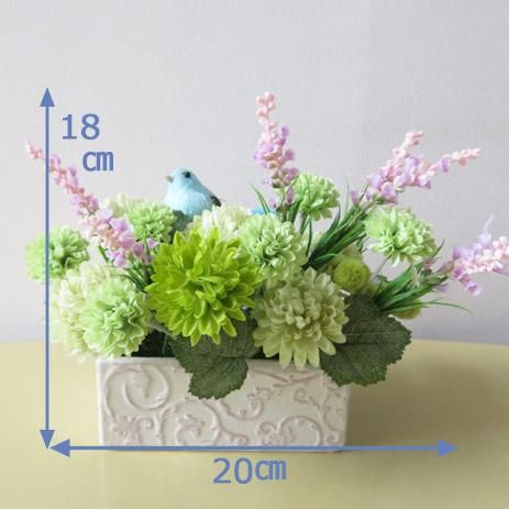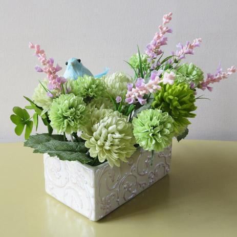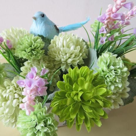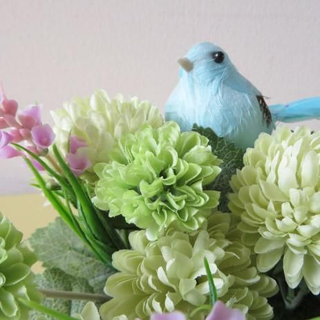 マムと「幸せの青い鳥」の造花アレンジメントです。花器は、国内トップメーカーの陶器製です。