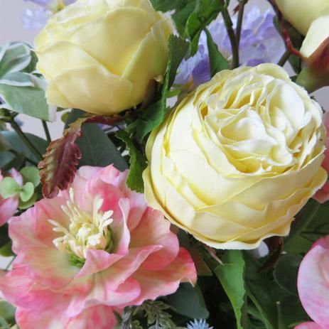 豊かな花びらのイエローローズと柔らかなノーゼンカズラが素敵な、高級造花アレンジメントです。