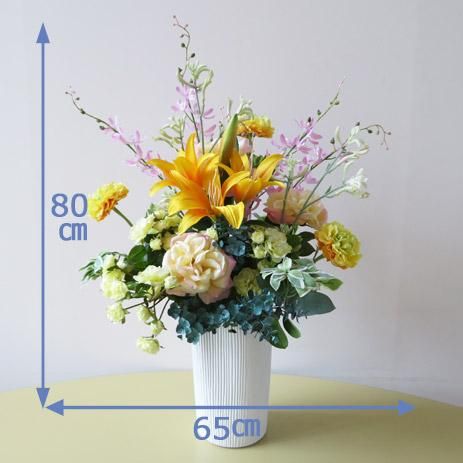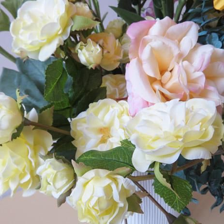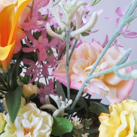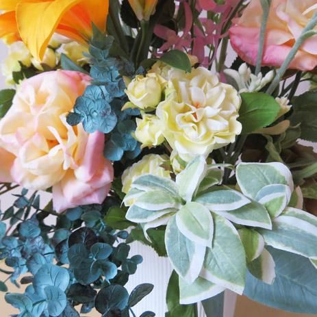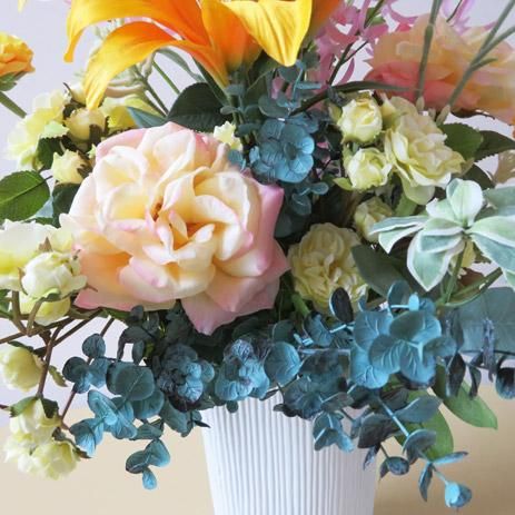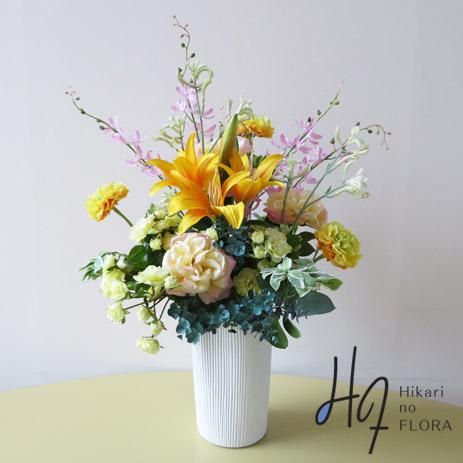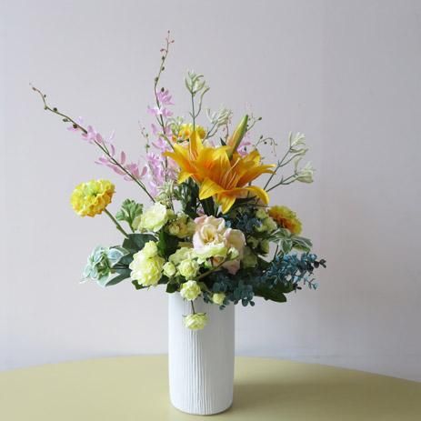 花材は、シンビジューム、リリー、カンガルーポー、ローズ、ラナンキュラス、ユーフォルビア、ハイドレンジア、ユーカリなどです。花器は、ハンドメイドのテクスチャとオーガニックな形状が特徴の陶器製です。シンプルなホワイトマット仕上げで、ナチュラルシンプルなインテリアです。