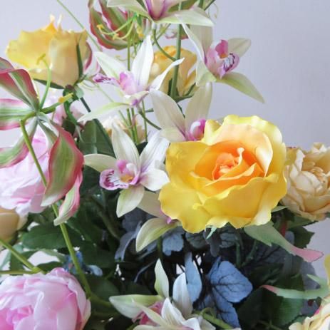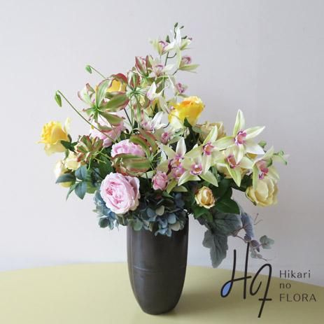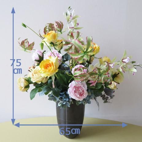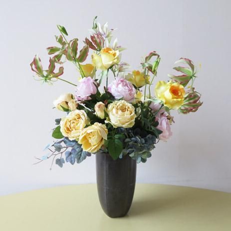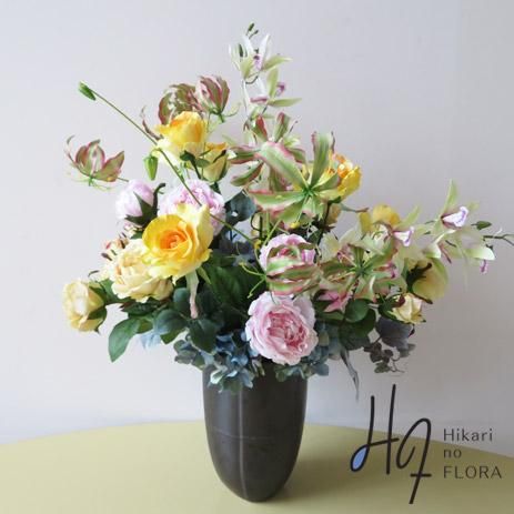 光触媒造花アレンジメント【エルマ】グロリオサがバラの中で伸びやかに咲き誇ります。人気のイエローの高級造花アレンジメントです。