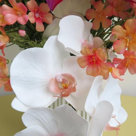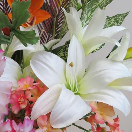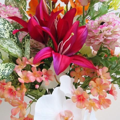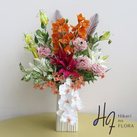 ビュティーレッドのリリィー、オレンジのリアル感あるシンビジューム。胡蝶蘭も入れ、さらにリーフを入れて重厚感を演出しました。見事なシンビジュームにあわせて小花もオレンジ色で合わせて、華やかにしました。