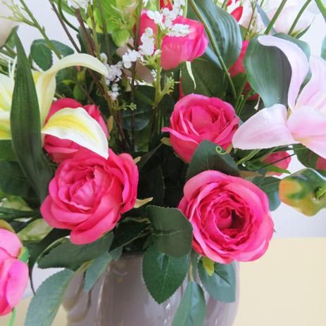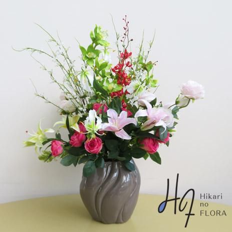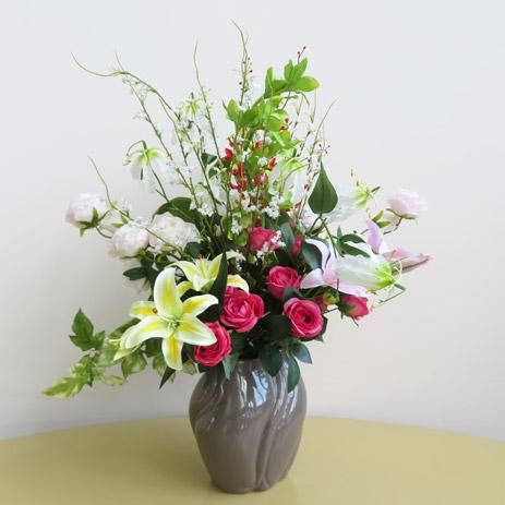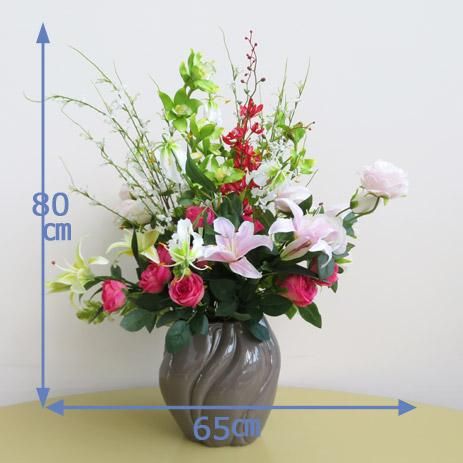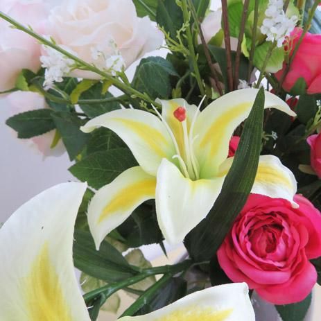 カサブランカの流れるかのような配置と、その上の彩色の綺麗なシンビジューム、そしてローズ。豪華で可憐な高級造花アレンジメントです。