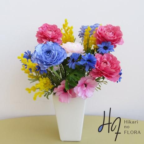 光触媒高級造花アレンジメント【アルグレ】ミモザとラナンキュラスの高級造花アレンジメントです。高さ45cmです