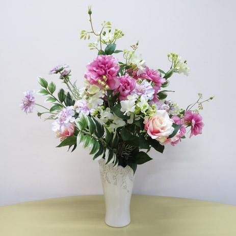 バラの伸びやかな枝とスカピオサの個性的な花がマッチする高級造花アレンジメントです。