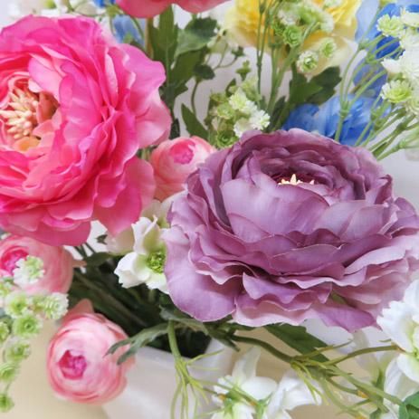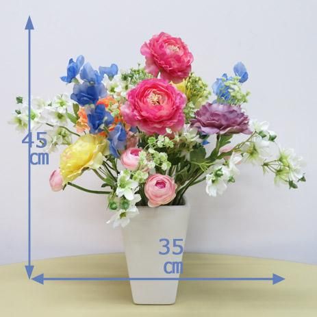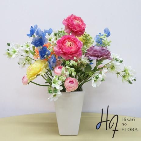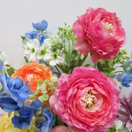 光触媒高級造花アレンジメント【エゲリ】4色のラナンキュラスが、明るい気持ちにさせてくれます。高さ45cmです