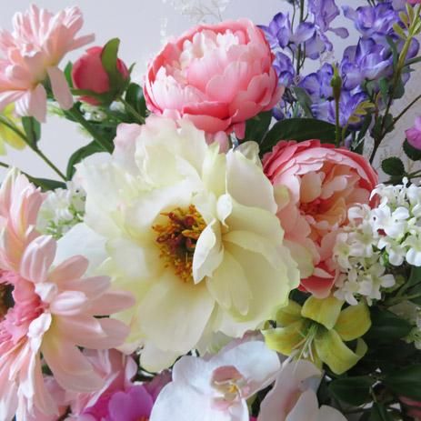 花材は、胡蝶蘭、デルフィニューム、芍薬、リリー、ジャスミン、リモニウム、ガーベラ、バラなどです